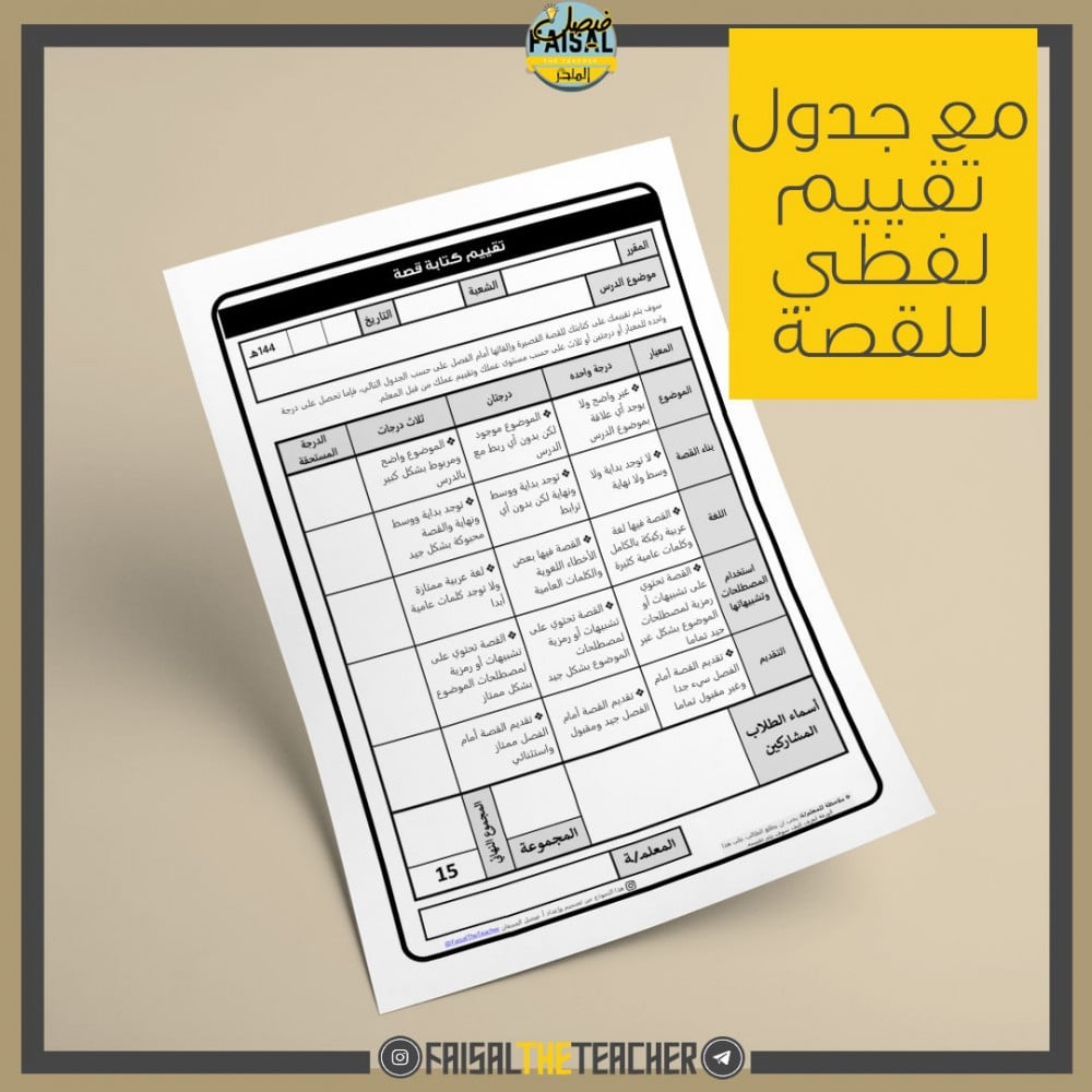 - يطلب منهم كتابة قصة على حسب المعايير المكتوب في جدول التقييم اللفظي المرافق لهذا النموذج.