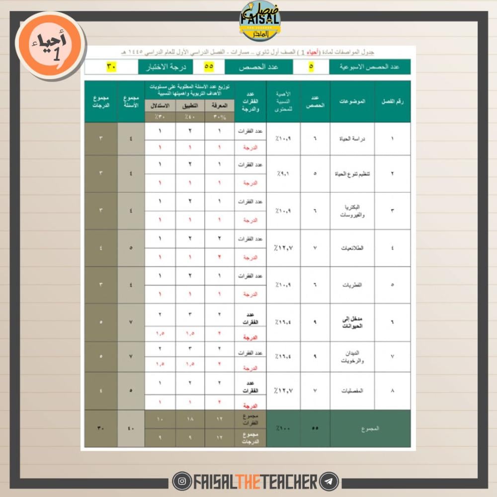 💡 نموذج اختبار نهائي نظري + نموذج الاجابة لمقرر (أحياء 1 - الفصل الأول) من 40 فقرة على جدول المواصفات للإدراة التعليم بجازان
