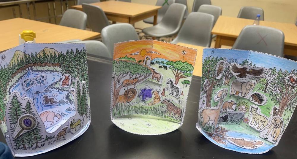 - يقوم الطالب بتلوين وقص وطي هذه الرسومات لينتهي به المطاف بإنتاج نموذج ثلاثي الابعاد (مجسم ورقي) يمثل المنطقة الحيوية المراد دراستها.