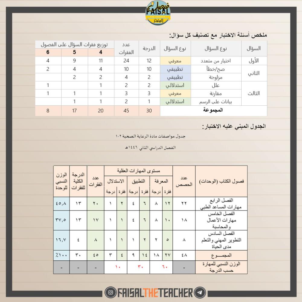 💡 نموذج اختبار نهائي نظري + نموذج الاجابة لمقرر (الرعاية الصحية 1-2 - الفصل الثاني) من 45 فقرة على جدول المواصفات للإدراة التعليم بمكة المكرمة